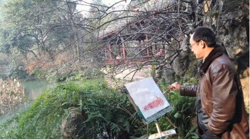 中国当代艺术家曹雕在四川成都草堂写生