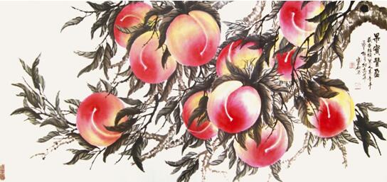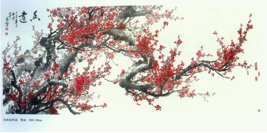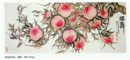 刘凤仙创作,意存笔先,画尽意在,豪放不显张扬,意境深远而不失恬淡清新,其梅花或艳如朝霞或白似瑞雪;寿桃或娇艳欲滴或灵秀芬芳,阵阵暗香仿佛跃出纸面,扑面而来,巧妙的将自然灵性点染画中,好似呼唤出了中国千年文化底蕴的深沉回声,诠释了中华民族古老艺术的深刻内涵。