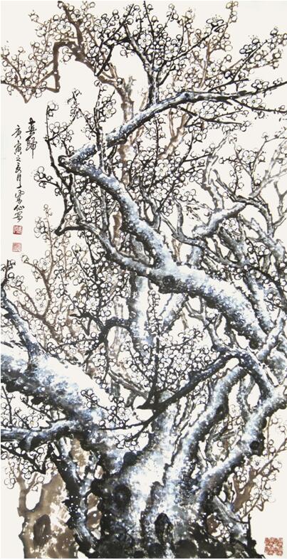 刘凤仙笔下之梅花,气韵生动,墨法自然,凌霜傲雪,气势磅礴,枝干清癯,苍劲嶙峋。寿桃,饱满圆润,枝繁叶茂,形神兼备,栩栩如生,独家创作,堪称一绝。她的这两类画作行笔豪放恣纵,用墨清新飘逸、潇洒淋漓,飘溢着冷冽的清香,蕴含着饱满的汁水,线条婀娜多姿,枝干凝重厚实,她的其他作品也颇见功力,正因为如此,常常被人们称为‘女中豪杰’。