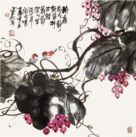 绘画作品中的诗文跋语往往代表作品主人的心声。一句好诗,能表现出作者的内涵和学养。一句好诗,亦能起到画龙点睛的作用。刘凤仙作品中的诗句布局巧妙,胸怀天地,在构图上,突出主体,讲求布局中的虚实对比与顾盼呼应,把发挥画意的诗歌题句,用与画风相协调的书法在适当的位置书写出来,辅以印章,成为一种以画为主的综合性书画艺术作品,留白空间的疏、密、聚、散;花、果、鸟、叶的柔嫩灵活,老干边缘的毛、涩质感,无不显示其作品的巧夺天工。
