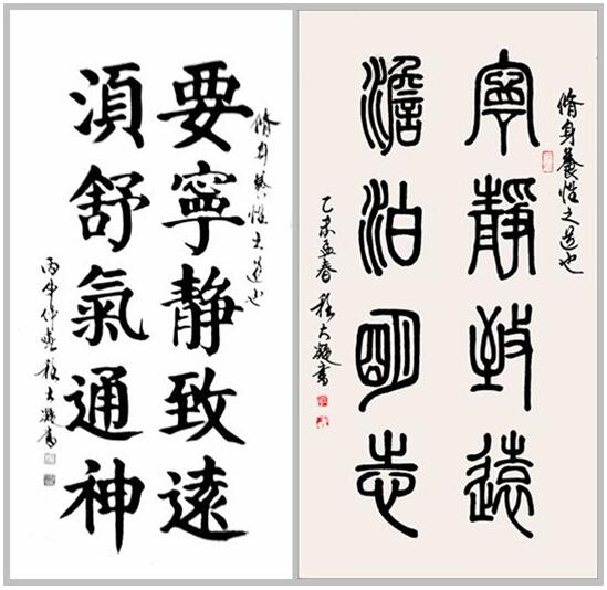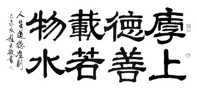 程大凝先生的书法笔运酣畅,气势流动,收纵有度,使字形筋骨劲健。神气外露而精气内含。观其隶书,形中无常、法中不拘、清净纯澈、不躁不郁。相信他的书艺人生也将在不止研索的道路上,绽放得更加灿烂辉煌!