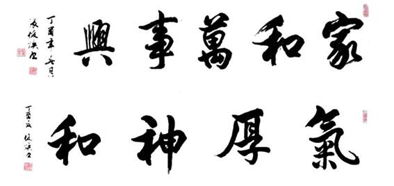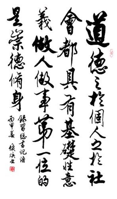 他的书法字如其人,正气凛然,严守法度,中规中矩,线条遒劲有力,沉稳中不失灵动,飘逸中隐含雄强。“慈悲为本,利他为先”八个大字,字形干净利落、精干劲挺,最大限度地发挥着笔墨的特性。先生落笔尽量制造笔墨效果,在点线的细节上精心安排,毫不含糊,而往往又注重于细微之处的运笔用墨技巧变化与自身的抒情倾向。手下之笔运用自如,开合疏密尽在掌握之中,继而呈现出幅幅经典之作。