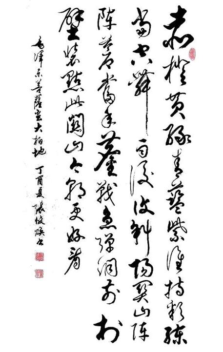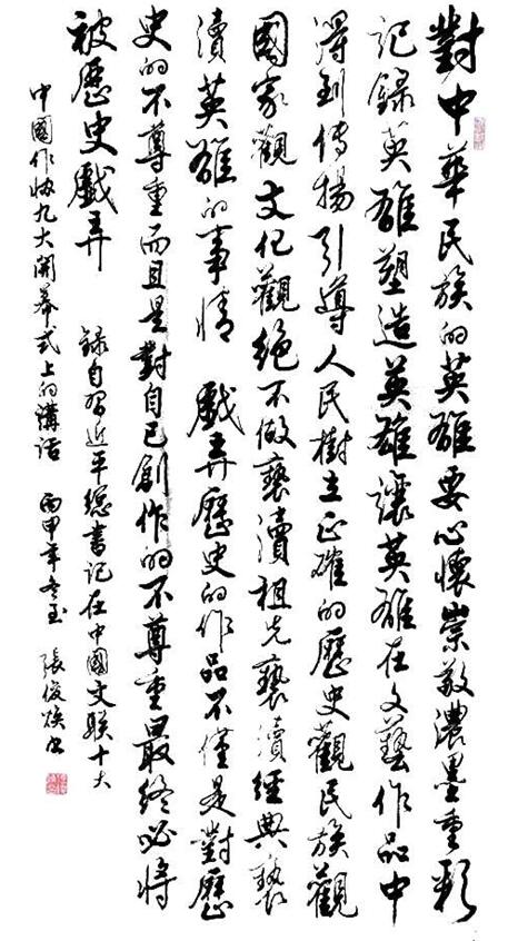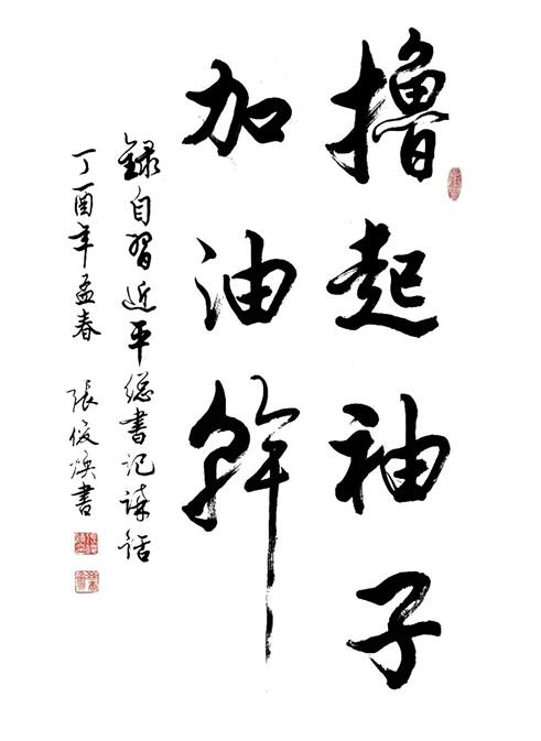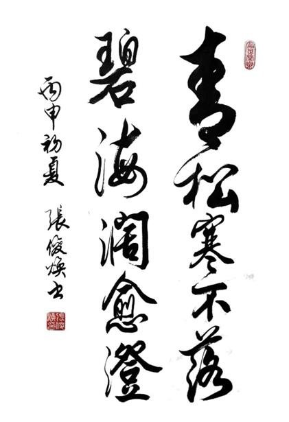 有了深厚的文化功底,又能摆脱掉名利的羁绊,胸怀自然开阔、眼界自然高远,因而,张俊焕先生的艺术修养、美学追求皆能达到常人不可匹及之高度。笔墨当随时代,这是每一位书法家必须遵循或追求的“典章律法”。而张先生对书法艺术的追求之路就力求达到字与字之间的贯通,墨韵的协调,笔法既有金石味,又有书卷气,作品中也时常蕴含着对时代的感悟。相信坚持本真坚持创作的张俊焕先生定能为创作出更多丰富时代的卓越作品。