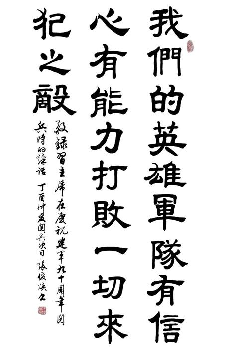 “正道直行,竭忠尽智”张俊焕先生书写文字亦为书写自身心智,他的文字笔画间、行文韵味中透露出的皆为刚直正气,而亦有儒雅的飘逸孕育期中。观其作品不仅令人精神振奋,更有一种悠游的浮想,作品显露出来的儒雅之境也外显着文人气息。在书画作品的表现技巧上,运笔的轻重缓急皆被其表现得自然妥帖,稳重间在笔墨的运用间笔路清晰可辨,彰显大家之风范。