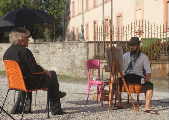 洛迦诺电影节70周年系列活动之一“Face to Face in Locarno”:艺术家童雁汝南正在创作中,模特为意大利著名电影批评家Ugo Brusaporco