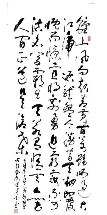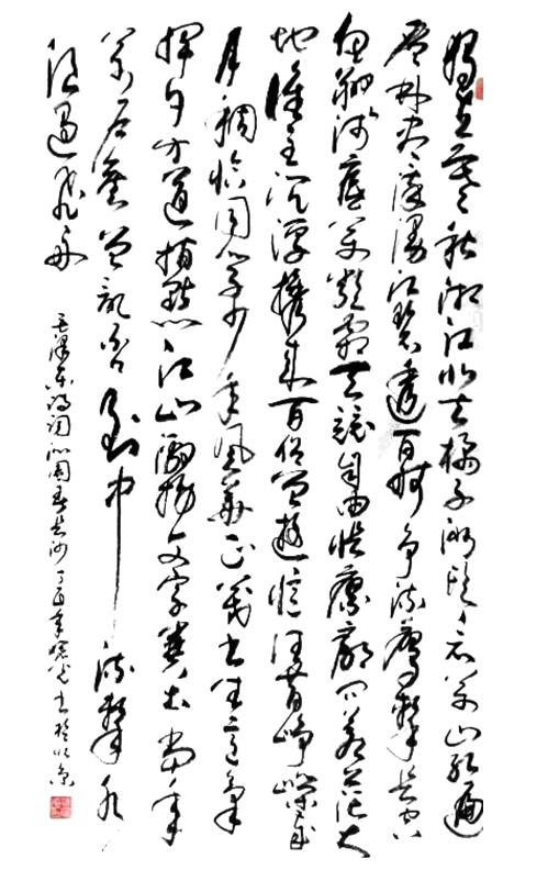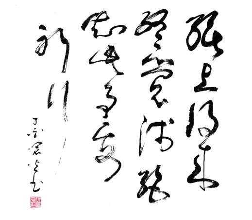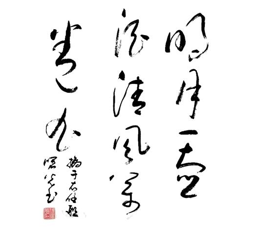 徐先生“雪竹”的意境之美,美在简洁明快,与大自然抗争的艰苦卓绝精神。画幅上三五枝瘦劲的竹子,从石缝中挺然屹立,坚韧不拔。随风弯曲而不折。凌乱摇曳的叶锋,与委婉圆润的草书,一刚一柔,相得益彰。不经意间,作者借竹势抒发出自己洒脱豁达的胸臆。