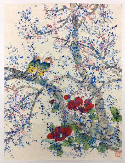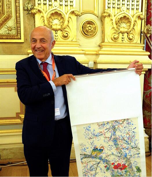 在第二届中法文化论坛法国里昂当代艺术双年展期间,让艾尔维.劳仁子 M. Jean-Hervé Lorenzi, 法国罗斯柴尔德家族集团管理层,法国经济学家圈会长代表罗斯柴尔德家族收藏了何颖作品《傍花阴玉鹦瑶》