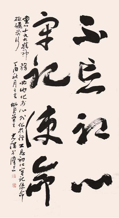 瞿忠谋作品中就很温和地渗透着这种古典情愫,而这种渗透方式也是古典的,其书以帖学为主,亦辅之以碑,故能深探笔法,曲直兼用,轻重协和。曲者,流转畅快;直者,截断涩迟;轻者,提调飞举;重者,按顿力透。帖之出韵,碑之藏质,亦统于笔法之繁复。而其且秀且雄,似无定局,实为广辟门径;且进且融,皆应境写意,以形写心,未忘技进乎道之奥义也。然其亦有尤擅者,惟其大而愈佳,浓墨重笔,气满势足,临机生发而抒情昂昂然也。反之,有不著力之作,平之,缓之,散之,漫之,另立一极,此动静之殊也。(徐本一《且秀且雄 且进且融——瞿忠谋书法作品集序》)
