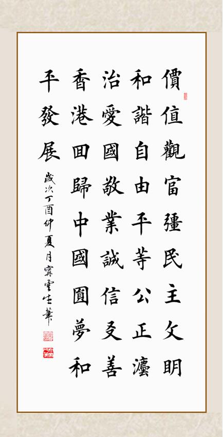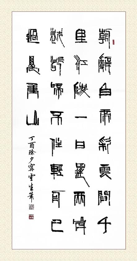 宁云生:男 汉族,中共党员,大学学历。祖籍河南漯河(工商系统退休干部) 1954年11月出生在云南丽江一个军人家庭,(父母是南下军人书香门第),自幼跟随母亲习字画画,十四岁已初露头角,后考入湖北轻工业学院美术系深造(现为湖北工学院),被当今最著名书画家彭祖华教授收为入室弟子并得到了真传,吸收了彭草的精华,(其草书被誉为地方一怪)书画作品远销美国及东南亚。在恩师的传承下还系统地学习了历代书画名家的技法风格;同时也得到了书画界名家梁邦正教授、刘维之教授、胡廷林教授以及胡琪教授的精心指导。先后临写了柳公权、颜真卿、王羲之、欧阳询的碑刻,研究古人的章法技巧。近几年又拜当代著名书法大家田英章为师,苦练 “田楷”,并多次得到大师们的指点,奠定了较深的书法基础。近三年书法作品多次参加国家、国际级的大赛获铜奖两项、银奖两项、一等奖三项、金奖四项、特等奖一项。先后加入中国书画研究会任理事、湖北京山书法家协会理事、中国硬笔书法协会会员、中国海峡两岸书画家协会会员、世界华人华侨艺术家联合会会员、中国艺术家联合会会员、中国国际书法艺术家协会会员、被中国国际书协授予“名人书画百杰 ”,被中国艺联授予“艺术先锋人物”并被中华全国总工会老年书画研究会、外交部老年书画研究会,中国硬笔书画协会对外交易委员会等十多家单位授予一级书法师,中华爱国艺术家和当代杰出书法家称号。其作品分别在《炎黄书画精品集》、《全国诗书画精品集》、《翰墨姻缘》《香港回归》《建军九十周年书画作品集》、《长征胜利八十周年书画集》《伟人颂书画作品集》《羲之书画报》、《不忘初心跟党走》等十多种不同的专业书画精品集中出版发行。2017年被评为“盛世中华”全国新时期先锋人物,中国新时代文艺传承人物。是王羲之书画报.诗书画家网、报、特聘签约书法家。受聘为中国诗书画家网艺术家委员会副会长,副主席等职。