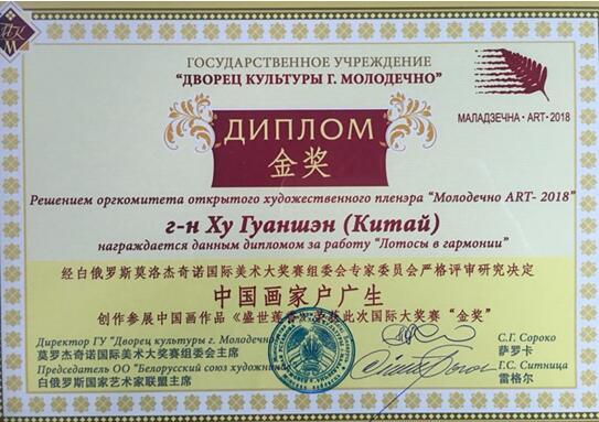 2018年7月3日国际美术大奖赛在白俄罗斯莫洛杰奇诺隆重举行颁奖盛典!经国际美术大奖赛组委会专家评审层层选拔决定授予:中国人民大学艺术学院书画导师、国家一级美术师、著名画家户广生(艺鸿)国际美术大奖赛(金奖)。希望能创作出更多更好的作品为国际美术的多元融合做出贡献!受白俄罗斯文化联盟中国首席代表刘瀚锴与白俄罗斯文化联盟主席、国家博物馆馆长、国家美术馆馆长菠罗克•波佐夫、白俄罗斯文化联盟副主席国沙等领导的邀请中国人民大学艺术学院书画导师、国家一级美术师、著名画家户广生先生于2018年6月28日赴白俄罗斯参加国际美术大奖赛!国际美术大奖赛于2018年6月28日至7月3日,在白俄罗斯文化首都莫洛吉奇诺隆重举行!由来自中国、俄罗斯、印度、白俄罗斯、乌克兰、立陶宛、波兰、拉脱维亚等国的著名艺术家欢聚一堂,共同谱写世界绘画艺术史上的新篇章!此次国际大奖赛组委会主席由白俄罗斯国家议会教科文组织委员会主席—萨罗卡女士担任! 此次展出户广生中国画作品9幅并参与评奖!