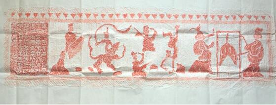主题是《乐舞百戏》。其画像从左一是男主人观看表演,一奴仆跪伏于地。左二是一女伎作踏拊长袖舞,中帛凌起,舞姿轻盈。右一是二人撞钟伴奏。右二是二人演杂技倒立频闪舞。反映了墓主人对生前娱乐生活的留恋和消除寂寞烦恼的追求梦想。又证实了繁荣的东汉文化艺术乐舞百戏,是一颗璀璨明珠,其艺术成就引人瞩目。