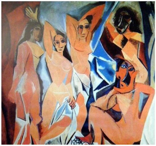 在这里,毕加索破坏了许多东西,可是,在这破坏的过程中他又获得了什么呢?当我们从第一眼见到此画的震惊中恢复过来,便开始发现,那种破坏却是相当地井井有条:所有的东西,无论是形象还是背景,都被分解为带角的几何块面。我们注意到,这些碎块并不是扁平的,它们由于被衬上阴影而具有了某种三度空间的感觉。我们并不总能确定它们是凹进去还是凸出来;它们看起来有的象实体的块面,有的则象是透明体的碎片。这些非同寻常的块面,使画面具有了某种完整性与连续性。从这幅画上,可看出一种在二维平面上表现三维空间的新手法,我们看见,画面中央的两个形象脸部呈正面,但其鼻子却画成了侧面;左边形象侧面的头部,眼睛却是正面的。不同角度的视象被结合在同一个形象上。这种所谓“同时性视象”的语言,被更加明显地用在了画面右边那个蹲着的形象上。这个呈四分之三背面的形象,由于受到分解与拼接的处理,而脱离了脊柱的中轴。它的腿和臂均被拉长,暗示着向深处的延伸;而那头部也被拧了过来,直楞楞地对着观者。毕加索似乎是围着形象绕了180度之后,才将诸角度的视象综合为这一形象的。这种画法,彻底打破了自意大利文艺复兴之始的五百年来透视法则对画家的限制。这幅画充分体现了画取其骨便为字,字添其肉便为画。外加一个心和创造力,才能创作出精品之作。