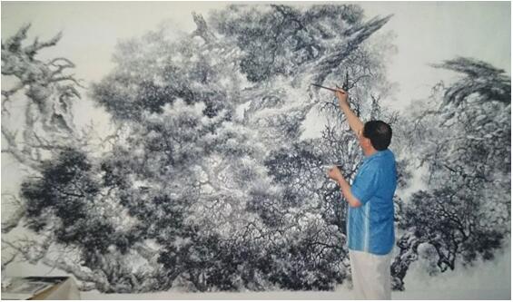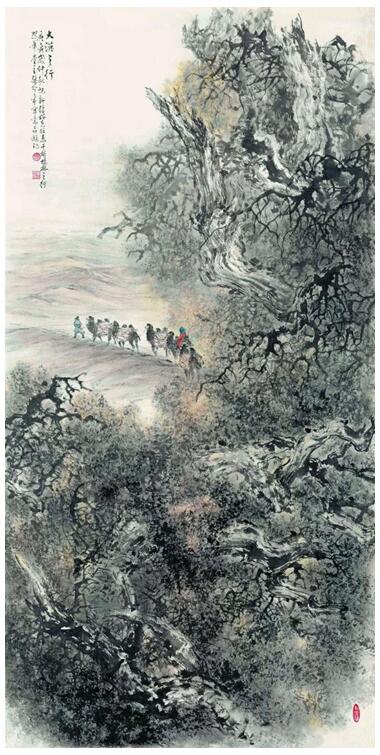 但张介宇先生喜欢的却是大境界、大气势,是巨幅宏制。这种大画面需要大造型,大造型又难离小细节,而这一切又有赖外师造化,搜尽奇峰。