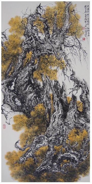 我一边摩挲着像铮铮铁骨的胡杨枝,一边看着张介宇,心中充满无限感慨。一个经历了这么多苦难的人,却不失其赤子之心,对生活只存感激,对他人永怀感恩,对生命满怀热爱,对祖国无限忠诚,对艺术精益求精。一个人,处贫贱而不移,居富贵而不骄,穷不改其乐,达不变其志,永远只对高尚美丽的事物心存景仰,这难道不是贤人吗?我相信,他以如此巨大的热情和精力投入到《胡杨礼赞》的创作中,一定是那片沙漠中的胡杨林从灵魂深处激起了他的共鸣。他在题记中写道:“胡杨不屈不挠的精神深深地震撼了我的灵魂,我为它不眠,为它忘食,将自己的生命与他千缠万绕的交织在一起,熔铸在一块。无数个晨晓夜昏,年复一年的似水流过,我与胡杨难解难分,同语共舞。”是的,《胡杨礼赞》其实就是张介宇的自传,唯其如此,它在如此人格化,每一棵树,似乎都是他生命中的某个片断,某段身影。狂歌也好,浩叹也好,长啸也好,低回也好,沉默也好,那都是生命热真的精彩华章。“凡存在的,必永生。”