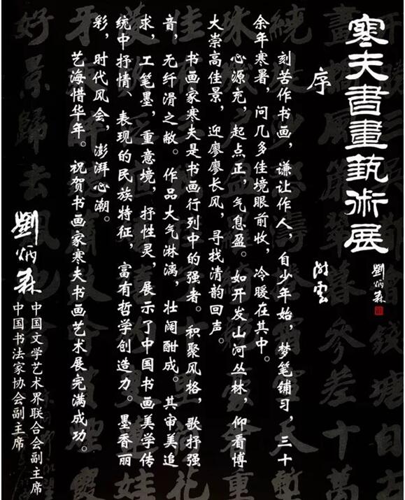 此外,寒夫诗、词、赋名篇等,被全国多处人文景区勒碑及摩崖石刻。其书画作品由国际多国政要及文化机构广为收藏。书法方面,他开创了中国文字以来“行意甲骨文”之独特体貌;其绘画注重人文画的山水、花鸟与人物多重美学内涵的完美融合;其文学以“兼济天下”为使命。并于诗、词、歌、赋、论、评、哲、书、画等领域卓有成就,且于世独立。
