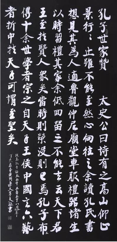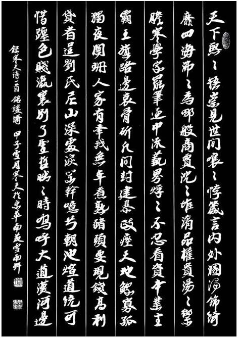 《铭镂歌》,虽说是一首律诗,然,却不亚于一篇讨伐今人享乐至上、物质第一的战斗宣言书。它清晰地批判了那些为了名利而赤膊上阵的众生相:它们是如此的可怜,又如此的微弱而可笑!楷书《铭镂歌》,以不骄不躁,道貌岸然之态,隽永而又至真至诚地抒发了书家“讨伐文化人渣,抨击艺术毒瘤”之坚强决心!读者从哪里都看得出作者那“兼济天下”之巨擘心灵的气概!
