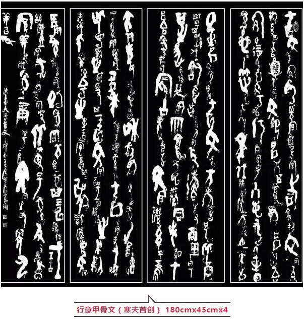 行意甲骨文:即在原始契刻甲骨文之基础上,使其笔画与结体趋于线美之动感,既不板刻,又不虚滑;字态在悠然之中得以持重游刃有余之灵动美。行意:快步行走之意;这里假借行书之笔意创规富有动感之甲骨文体貌。是谓“行意甲骨文”也欤。