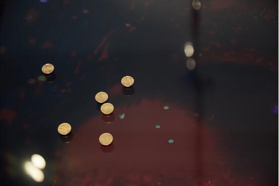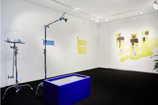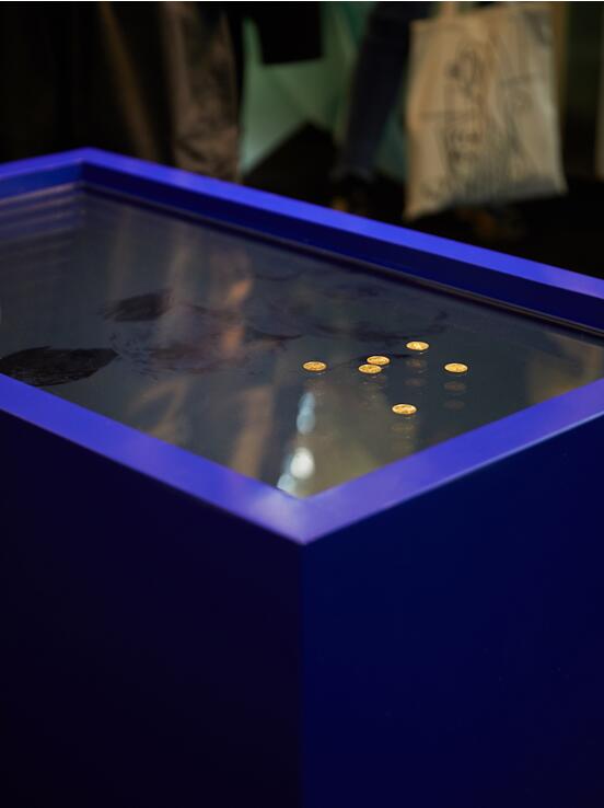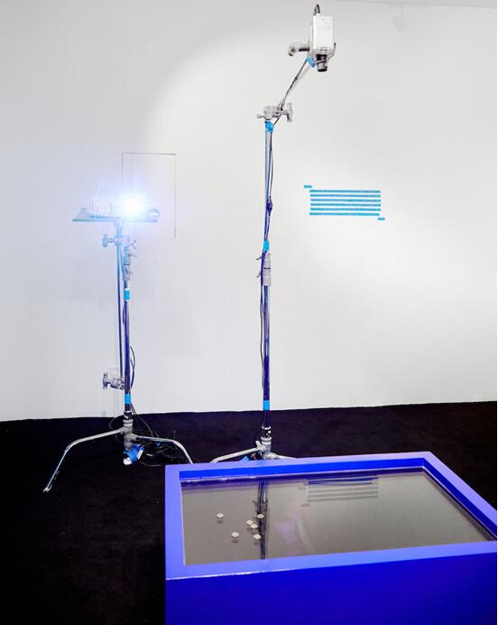 其实大家可以看到另外的一组作品——“无人值守”,和这次的展览结合到了一起的,我感觉做这些装置对我来说像做实验一样,不过这些实验只是为了抛出问题,并没有想解决它。如果看到的人应该可以看到影像「基路伯x2」通过一个显示器被投放了出来,这个显示器上面还有一层水,水里有6个5角钱的硬币,在这个“许愿池”的上方有一个监控摄像头拍摄,然后拍下的影像又通过投影仪投射到了玻璃床上。这里有两个现实层的干扰,一个是水面,一个是投影仪与玻璃之间。