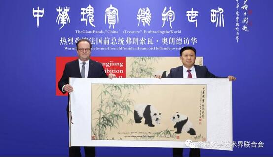 为表达对法国人民和奥朗德前总统的友好问侯,让熊猫文化世界共享,吴长江在现场向奥朗德前总统赠送了国宝熊猫作品《中华瑰宝拥抱世界》,奥朗德前总统欣然接受了这一特别礼物。