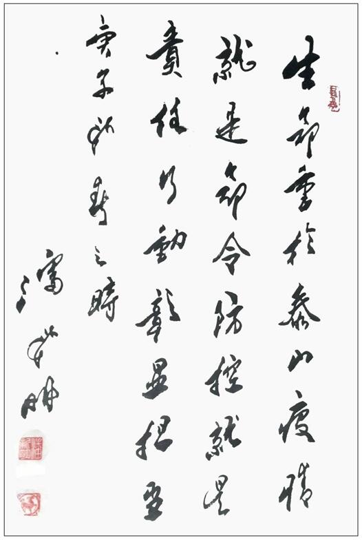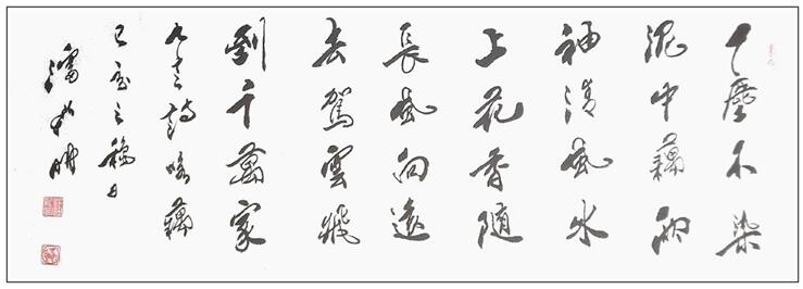 Mr. Pan Xinming's calligraphy works are also ingenious, and his free and easy expression of intention is lifelike. Side entry is fast and easy. Dragonflies skim the Pinghu Lake, making waves slightly. Touch the paper quickly into the center, unbiased, written as the middle of the water transport through the back of the paper. In the process of experiencing the awareness of this kind of writing, his calligraphy also wrote the free and easy implication of the calligraphy of the Jin Dynasty, which made the calligraphy turn freely, lift and press and beat, combine the body with elegance, and pay attention to the change of ink color and aura. Therefore, the line beauty and rhythm rhythm of calligraphy win-win, creating the aesthetic impression of walking in the wind. It's not rigid and changeable. It's full of vitality to change into ink. It's really a profound practice of nothing but cursive script in the world.