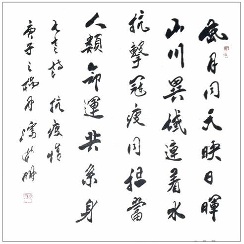 疫情面前,我们命运与共。疫情发生以来,中国和“一带一路”沿线国家相互支持。病毒对全世界不分种族、不分地域、跨越国界的“无差别攻击”,再次提醒人们,面对全球突发公共卫生事件,人类是唇齿相依、休戚与共的命运共同体。携手合作,战胜病毒!上下同欲者胜,同舟共济者赢。艺术家以书画先行展大国情怀,传递共同抗疫暖新闻、正能量。阳光总在风雨后。愿世界无恙,人类康宁!