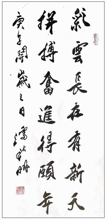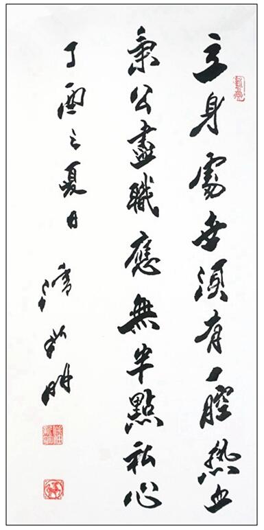 以诗益书修文人,放手写心传晋韵。两晋书法是高峰,潘新明先生师法二王执着功成鲜明。所以他的书法以二王书法的文人品格构建核心,形成了书法的正宗文化传承的时代内核,用笔墨当随时代的担当,让书法融进时代的思想和风尚,把本意简单的线条美,通过以白计黑的塑造,写成虚实照见的空间印象美妙,以美致韵,飞动丰神。传承与创新双轮驱动,让他攀上书法文化的顶峰,一览众山小,功矗凌云霄!