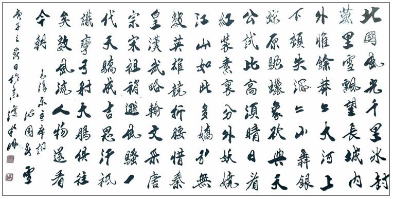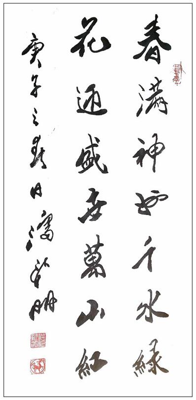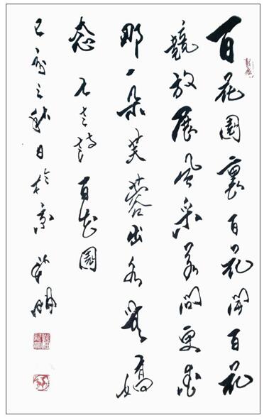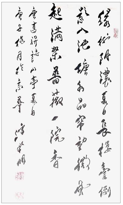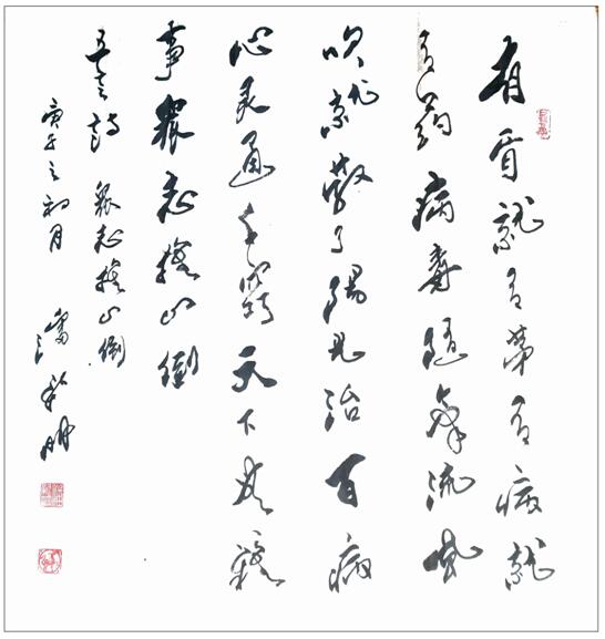 书法自古是文人修养的有机组成部分,文人把书法看成小技,把文章视为千古之事。潘新明先生的文化修养就是以诗意书的传统路径,他在书法家的身份背后,还是一位能赋诗书的真文人,写格律诗平仄严谨,对仗工整,格调清新高雅,读来怡心神。优秀的诗歌文化修养,让他的书法便注入了文人书法的书卷气韵,放手写心,如追闲云,也似春来杏花开,写得一手飞动传神的行草上品!