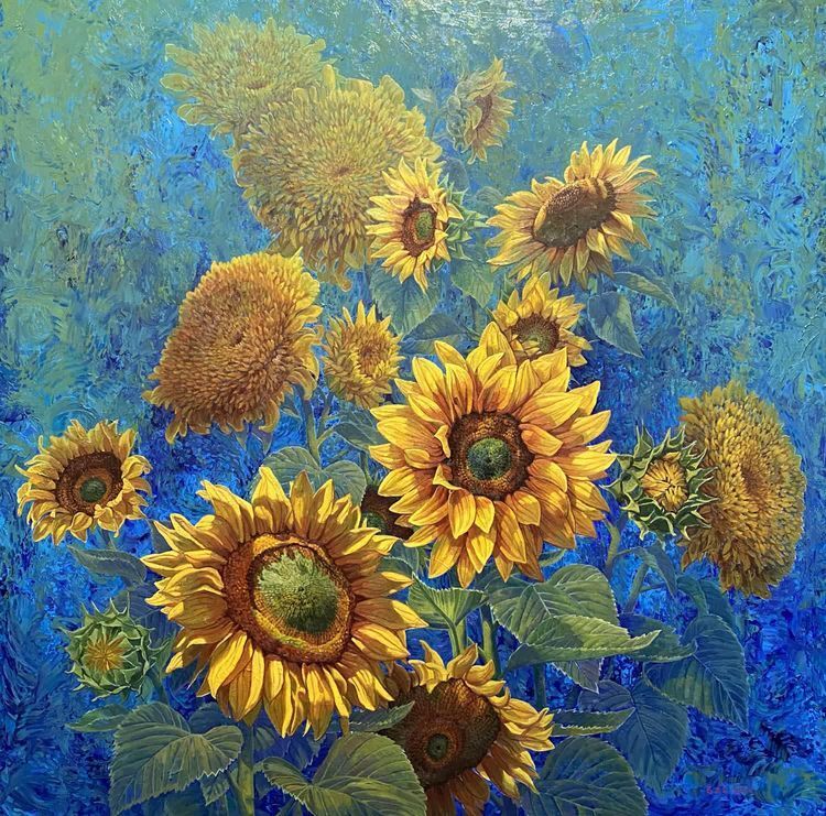 作品(向日葵)作者:高志定 作品尺寸:150x150cm 创作材料:雨露麻布面油画 创作年代2022年。当时创作者创作这幅向日葵花是用蓝、绿、的色彩抽象的背景来对比写实暖色的花朵看得出来内心充满一股力量,象征着热情与忠诚,他总是面向太阳,追着光和温暖。