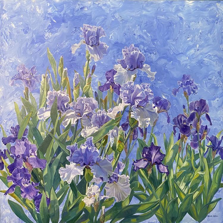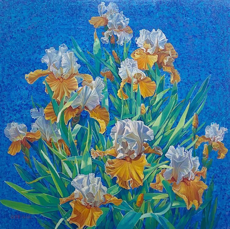 Work (iris) the author in the creation of this piece of work with blue purple green color system to find the color contrast relationship, with realistic and freehand brushwork approach to show the iris bloom so exuberant, like a life dancing in the wind.