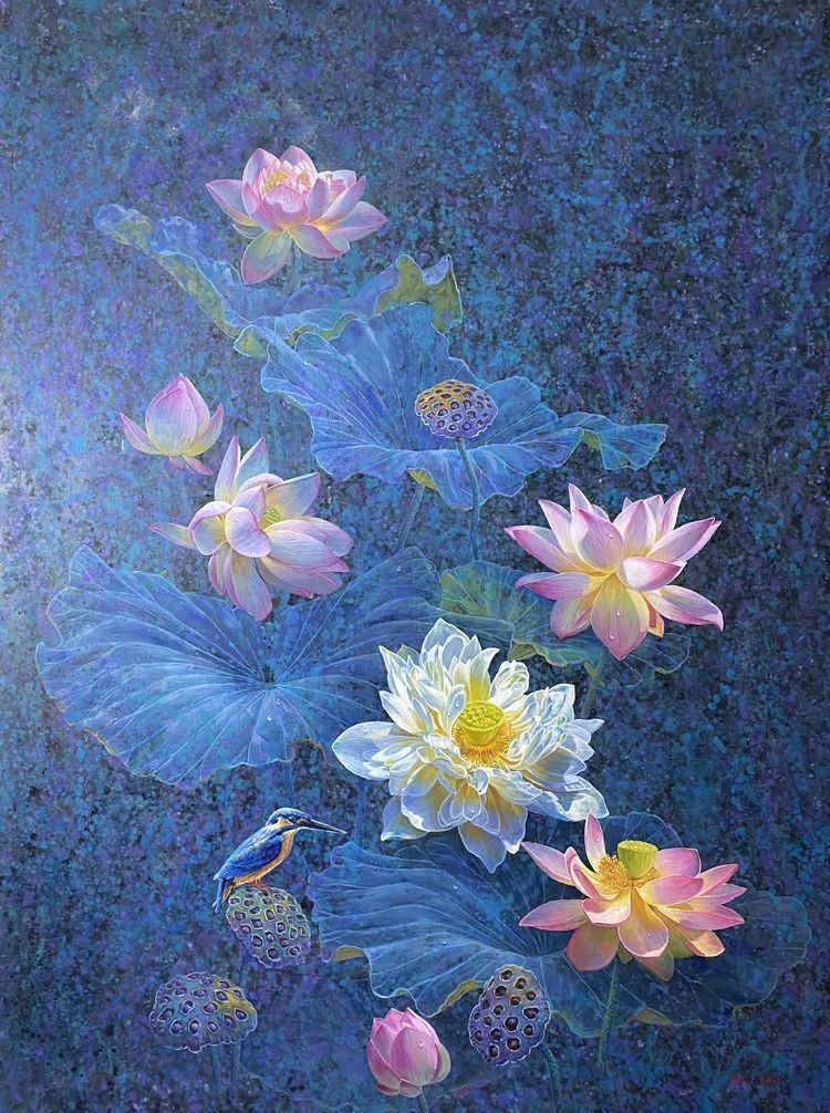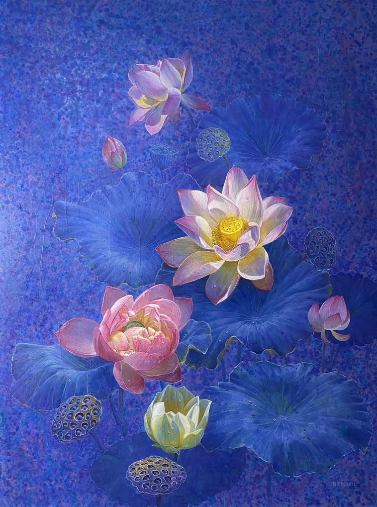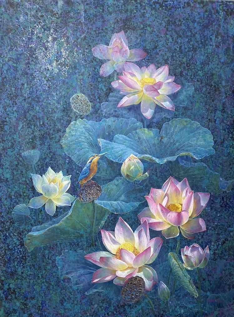 Introduction of the works:At that time, the author in the creation of this work when the mood is so calm and there is a force, the author with colorful blue background to express the lotus in the night sky is so quiet, the soul is also mixed with light.