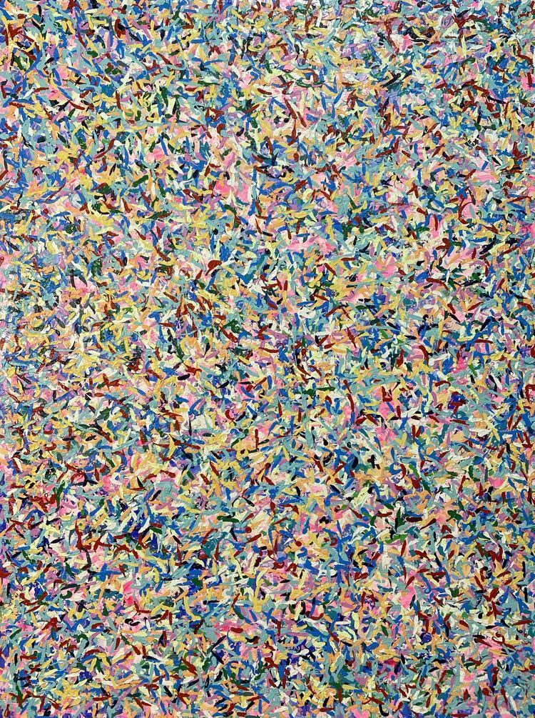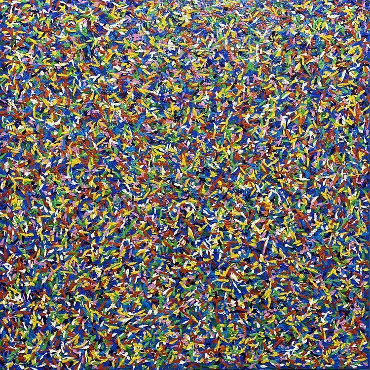作品介绍:作者用抽象的方式表达自己内心世界,在宁静的夜空里繁星点点,五彩斑斓的色彩带表着无数的星星,照亮整个天空,你是否多久没有停下来看看这个世界台头仰望星空。