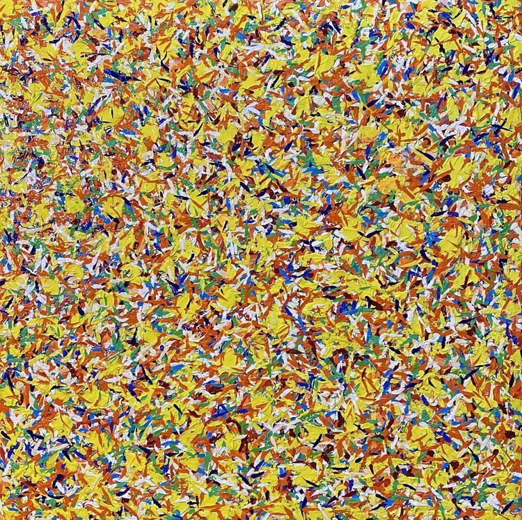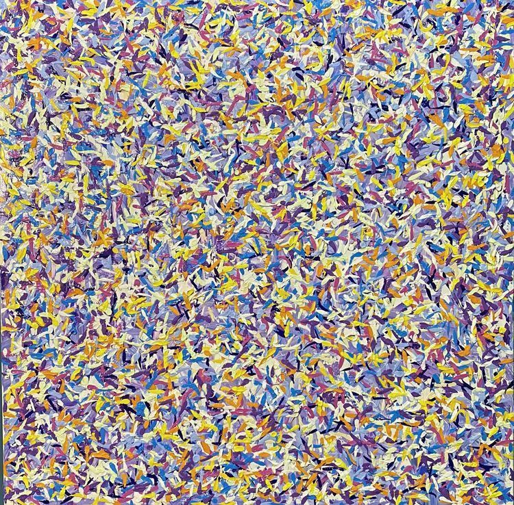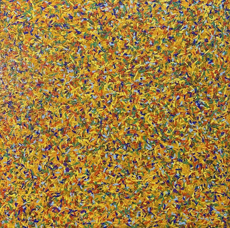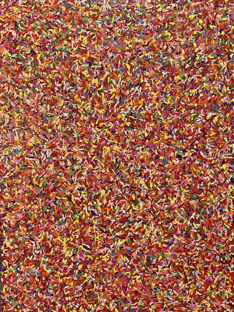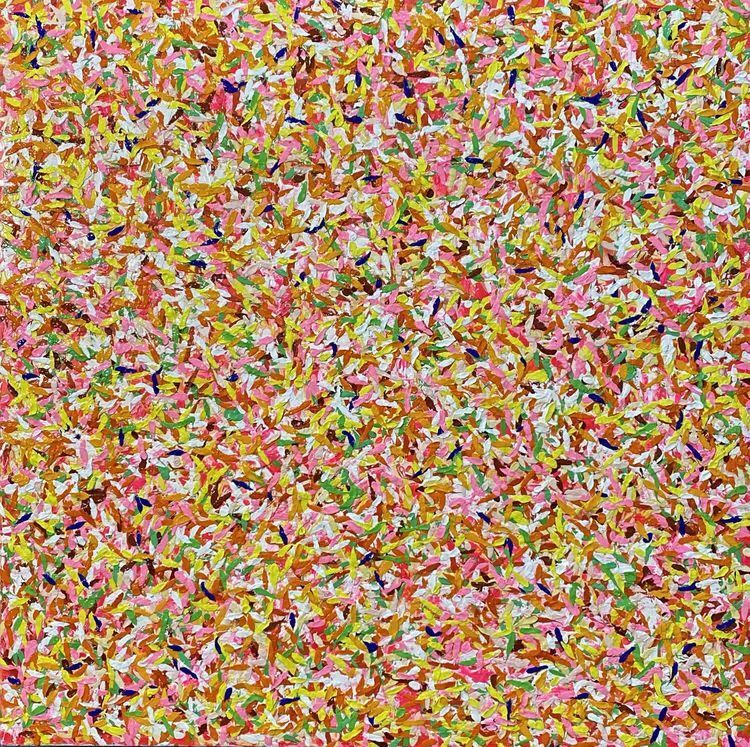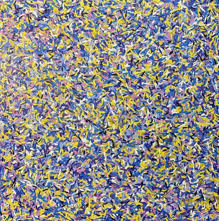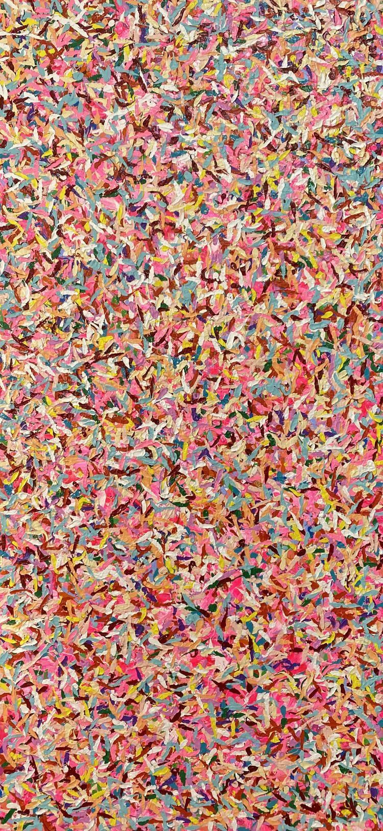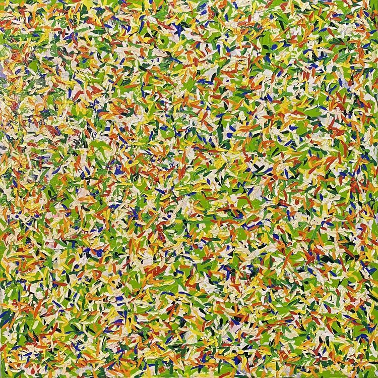 作品介绍:作者同样用抽象又印象的手法表现出内心中的花海,红色、粉色、黄色、青色,各种不同颜色的花朵朵怒放,象征着生命生生不息。