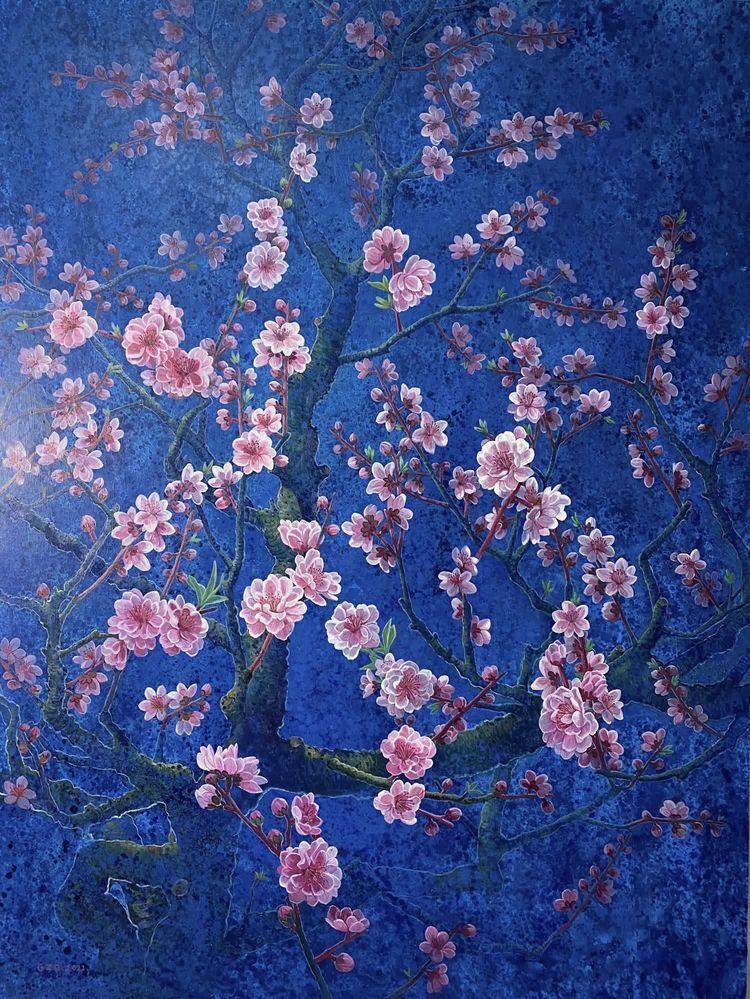 Introduction: The artist also uses abstract background realistic technique to express the peach blossom, let people feel a strong flavor of spring, at the same time, peach blossom also has a unique charm, she also represents the ideal life that people yearn for, peach blossom luck also refers to the fate of the good development.