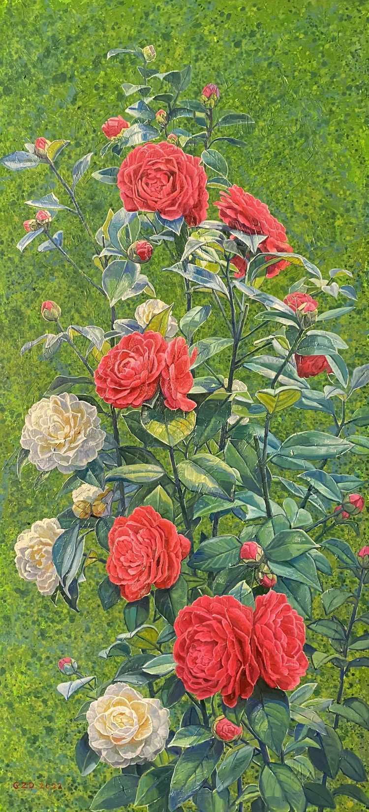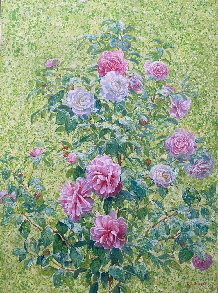 The author of the work (camellia) Gao Zhiding In the creation of this piece of work, the author adopts the technique between abstract freehand brushwork and realistic painting to express camellia. The author had a dream about a camellia, so he drew her.