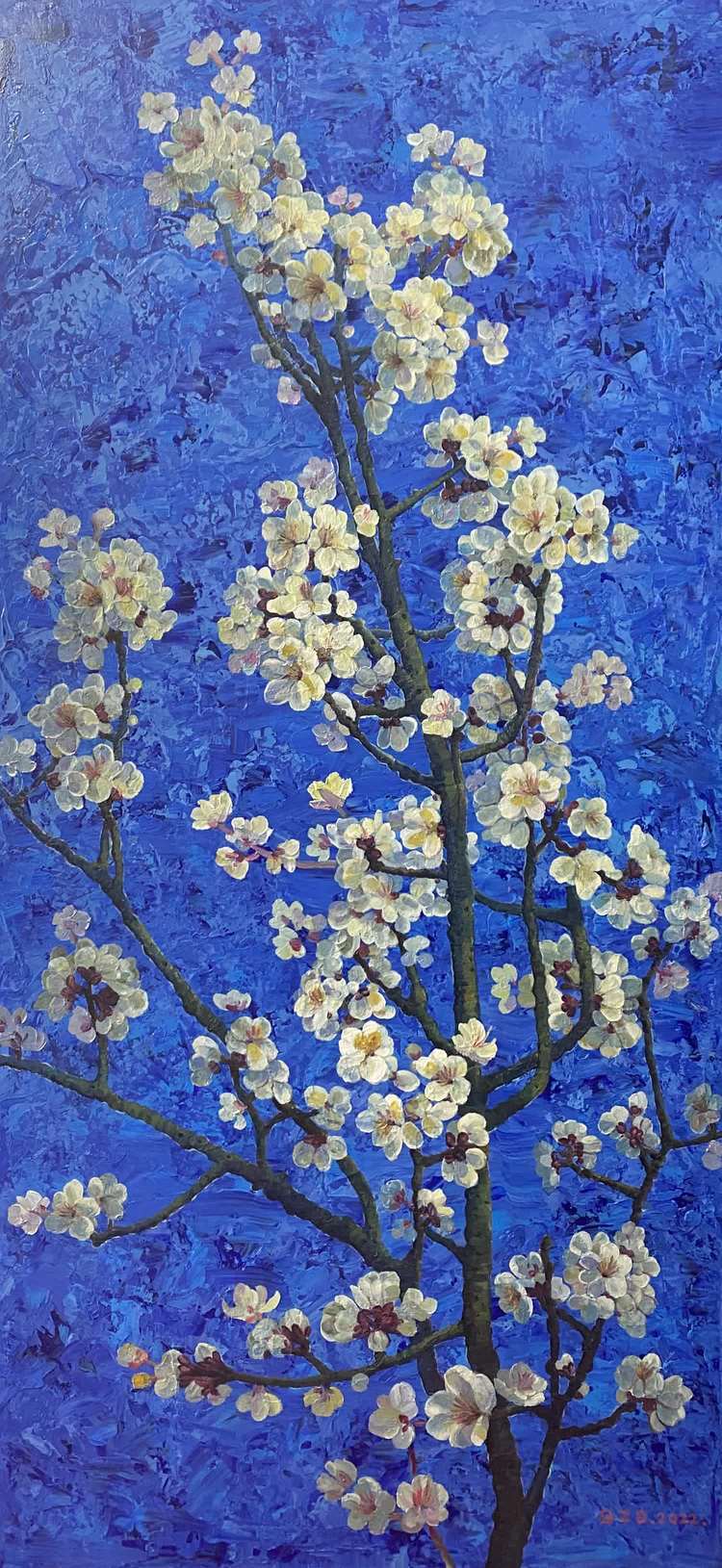 作品介绍:作者用写意的手法来表达杏花盛开它代表着幸福和羞涩的爱情,又像羞涩的少女一样,初期花是粉红色,后期逐渐变为白色,同时杏花也象征着生机勃勃的气息,美好的事物,以及顽强的生命力本质。