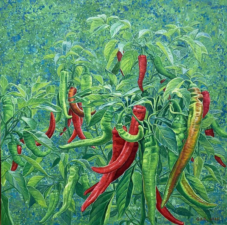 When creating this work, the artist also uses realistic techniques and abstract background to integrate the theme into a space, and some peppers are about to mature and some are mature.