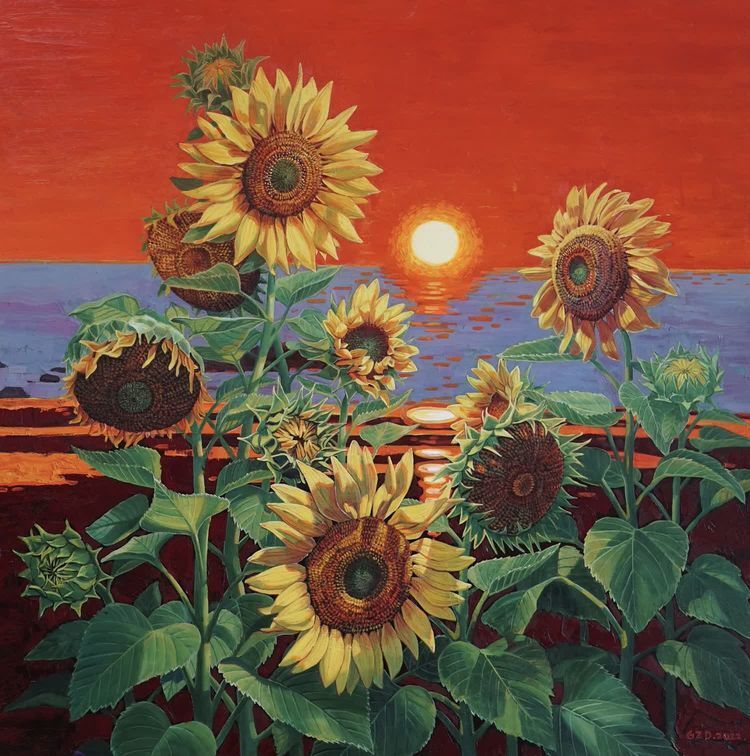 In the creation of this piece of work, the artist uses realistic techniques to express a large area of red and gray to express the dawn of the day, the sun rises, and the sea level. Sunflowers absorb energy when the sun shines on them. Sunflowers are like a family appointment to watch the sunrise together. When the sun hits the face, people feel a faint warmth. At the same time, sunflowers also represent vitality and health, positive, and the pursuit of a bright life.