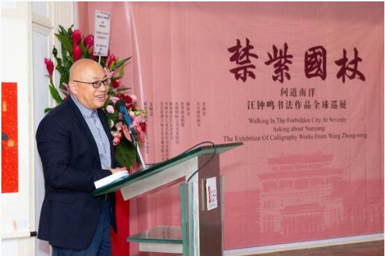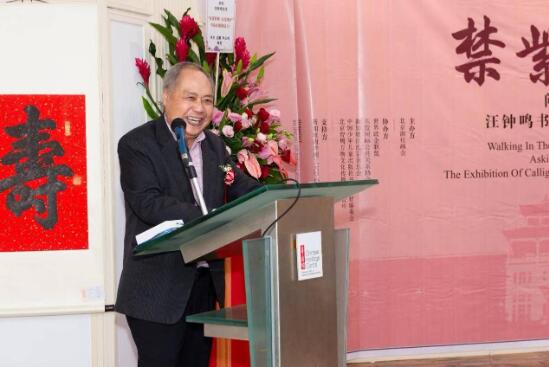 主办方湖社画会秘书长关志英先生在贺信中表示,很高兴在南洋理工大学华裔馆这样世界一流学府、一个有着历史文化底蕴的地方,举办“杖国紫禁问道南洋汪钟鸣书法作品展”,这也是汪钟鸣自北京故宫大展后开启全球巡展的第一站。湖社画会是中国近代美术史上最早的学术组织之一,也是近代北京美术界最早的学术组织,距今已有百年历史。湖社画会也是近代绘画家和大师的荟萃之地,百年来出现过诸多书画大师,如金北楼、周肇祥、陈师曾、齐白石、张大千、叶恭绰、陈半丁等等,对中国美术界的发展做出了巨大贡献。众所周知,书画同源。鉴于汪钟鸣先生的艺术成就以及在书法教育领域的巨大贡献,在北京故宫大展上湖社画会已经聘请其为顾问。
