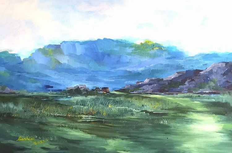 李安怀是一位中青年画家,他对创作有着深厚的情感和精湛的技艺。他不仅与传统的青绿、水墨画进行比较,还大胆地运用色彩。他的作品用笔精细而不琐碎,色彩瑰丽而不浮躁,使得青绿山水更加鲜明、突出,同时又不失文人画的韵味。