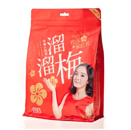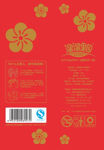 这款新品的包装一改自然清新的设计风格,以吉祥的大红色为背景颜色,画龙点金得加上几笔金色的梅花图案,显得十分的喜气洋洋,幸福欢乐。常言道:“梅花开尽杂花开,过尽行人群不来”但这与这款欢乐家庭装来说,梅花被永恒的封存了,梅香反而更浓了。与往常不同的是此次的新装拥有了独特的产品宣言:Let`s together!让我们在一起!这个世界上最浪漫的不是我爱你,而是让我们在一起!就让溜溜梅陪伴我们和我们所爱的人在一起吧!