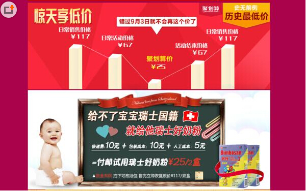 对于史无前例的最低价,也许有小伙伴会问,原价要卖100多元的奶粉却只卖25元,莫非其中有诈?亲,你真的想多了!其实这才是真相:25元是仅仅包含了快递费、包装成本、人工成本,而奶粉本身不收钱……所以这仅仅是一次聚划算吗?不,这是一次拿聚划算来做的付邮试用,我们的活动宗旨只是让中国妈妈体验一下瑞士奶粉领导品牌的高端品质!错过9月3日,可就没有这么好的机会了哦。可以说,如果您正好在为宝宝挑选一款合适的奶粉,那么这次活动就再适合不过了。