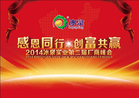2014年9月26日,冰泉实业召开第二届厂商峰会,董事长、总经理等集团领导及各地经销商欢聚一堂,共同分享2013年取得的辉煌业绩,探讨企业未来的发展方向。本届峰会的主题是“感恩同行,创富共赢”。董事长对各地经销商对于冰泉的支持表示感谢,紧接着围绕冰泉豆浆的品牌升级、产品更新、产品策略调整等与数百名经销商分享,统一冰泉发展的战略思想,寄望共同携手前行,将冰泉打造成为百年品牌。冰泉豆浆将会对品牌进行全面的升级改造,对产品的包装更新换代,确定了“可沟通,可体验”的产品策略,使消费者对冰泉品牌有一个全新的认知。