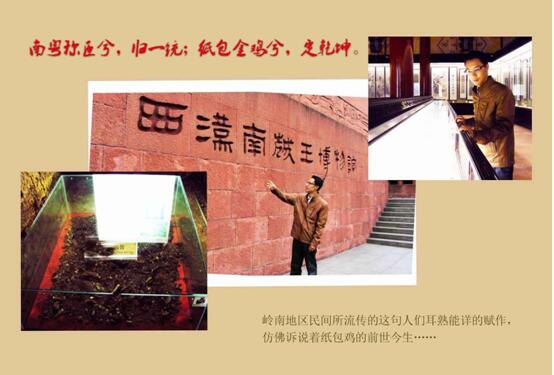 在我国,自古以来就有“无鸡不成宴”的习俗和讲究,集中、真实地体现了中国传统饮食文化理念和社会风俗习惯,鸡菜肴堪称中国传统节庆第一道菜,同时又是人们一日三餐的主要菜肴,纸包鸡堪称鸡菜肴中的代表作。广州,是岭南文明、珠江文明、广府文明、粤菜文化、岭南美食文化的重要发祥地,“食在广州”可谓名不虚传,纸包鸡作为宫廷贡品和日常主菜的历史至少已有2200年,始创于岭南地区,据考证,在见证了岭南地区(两广地区)文明史的西汉南越王墓中,就发掘出许多类似于纸包鸡的鸡骨头和残纸。相传,公元前203年,赵佗自号南越武帝,建立南越国,定都番禺(今广州),当时的南越王宴就是以纸包鸡作为主菜的。公元前202年,刘邦称帝,史称汉高祖,建立西汉王朝,定都长安(今陕西西安)。及后,赵佗以纸包鸡作为贡品献与刘邦,上表臣属西汉,刘邦品尝了纸包鸡之后龙颜大悦,诏封赵佗为南越王,至此天下归于大一统。民间流传着赋作云:“南粤称臣兮,归一统;纸包金鸡兮,定乾坤。”纸包鸡遂成为南越国向西汉王朝年年进贡、岁岁来朝的贡品。