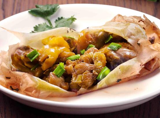 薄如蝉翼的玉扣纸、农家山地散养的三黄鸡、幽深醇厚的秘制卤汁,逐一陈列于案面之上,瞬时间,空气中弥漫着天地融和、原汁原味的诱人芳香!一切经已准备就绪,粤菜厨艺大师们开始运用巧妙的刀工,游刃有余地将三黄鸡切成一件一件,接着勺来秘制卤汁,配以老抽酱油、白酒、枸杞、姜汁、桂皮、八角、茴香、陈皮、草果、红谷米、古月粉等调味料腌制鸡肉,随后,铺开玉扣纸且用手抚平,再将鸡肉置于玉扣纸之上、撒些葱白粒,松紧得度地包裹起来。就这样,一份份如信封形状的纸包鸡包好了,造型优美、叠叠有致。将纸包鸡放入锅中,以花生油隔纸浸炸,片刻的功夫,热气腾腾的纸包鸡终于端上餐桌,一股浓浓的南粤气息扑面而来,轻轻地撕开玉扣纸,金光灿灿的纸包鸡奇妙地飘出了竹子那渗人心脾的缕缕清香,这是以新鲜的嫩竹和清澈的山泉水所制成的玉扣纸独有的香气,缓缓地放入口中,鸡肉鲜嫩甘滑、鸡味浓郁、醇厚不腻……