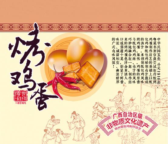 说起纸包鸡风味烤鸡蛋的渊源流变过程,不得不提及享誉海内外、流光溢彩的传世2200年“中国金鸡文化”(粤菜代表作)、中国味道、中国传统节庆第一道菜、广府中秋节庆三大美食、中华美食三大名鸡、广府美食三大名鸡、广西三宝、梧州四宝、桂林情结,中国名菜、中国十佳金鸡、广西非物质文化遗产、广西特产行销全国核心品牌、广西最具特色餐饮品牌纸包鸡,甚至可以将纸包鸡理解为纸包鸡风味烤鸡蛋的滥觞。薄如蝉翼的玉扣纸、农家山地散养的三黄鸡、幽深醇厚的秘制卤汁,逐一陈列于案面之上,瞬时间,空气中弥漫着天地融和、原汁原味的诱人芳香!一切经已准备就绪,粤菜厨艺大师们开始运用巧妙的刀工,游刃有余地将三黄鸡切成一件一件,接着勺来秘制卤汁,配以老抽酱油、白酒、枸杞、姜汁、桂皮、八角、茴香、陈皮、草果、红谷米、古月粉等调味料腌制鸡肉,随后,铺开玉扣纸且用手抚平,再将鸡肉置于玉扣纸之上、撒些葱白粒,松紧得度地包裹起来。就这样,一份份如信封形状的纸包鸡包好了,造型优美、叠叠有致。将纸包鸡放入锅中,以花生油隔纸浸炸,片刻的功夫,热气腾腾的纸包鸡终于端上餐桌,一股浓浓的南粤气息扑面而来,轻轻地撕开玉扣纸,金光灿灿的纸包鸡奇妙地飘出了竹子那渗人心脾的缕缕清香,这是以新鲜的嫩竹和清澈的山泉水所制成的玉扣纸独有的香气,缓缓地放入口中,鸡肉鲜嫩甘滑、鸡味浓郁、醇厚不腻……细品一下纸包鸡的历史文化,可以用“博大精深、源远流长”这8个字来形容。“南粤称臣兮,归一统;纸包金鸡兮,定乾坤。”岭南地区(两广地区)民间所流传的这句人们耳熟能详的赋作,仿佛诉说着纸包鸡的前世今生……据考证,在我国,自古以来就有“无鸡不成宴”的习俗和讲究,集中、真实地体现了中国传统饮食文化理念和社会风俗习惯,鸡菜肴堪称中国传统节庆第一道菜,同时又是人们一日三餐的主要菜肴,纸包鸡堪称鸡菜肴中的代表作,古有南越王、汉高祖、苍梧王、唐明皇、杨贵妃、苏轼、明太祖、靖江王、康有为,今有孙中山、陈济棠、白崇禧、徐悲鸿、秦牧、史玉柱等名人,都曾在纸包鸡的史册上留下足迹,为它增添了丰富的传奇色彩!纸包鸡作为宫廷贡品和日常主菜的历史至少已有2200年,始创于岭南地区,相传,公元前203年,赵佗自号南越武帝,建立南越国,定都番禺(今广州),当时的南越王宴就是以纸包鸡作为主菜的。公元前202年,刘邦称帝,史称汉高祖,建立西汉王朝,定都长安(今陕西西安)。及后,赵佗以纸包鸡作为贡品献与刘邦,上表臣属西汉,刘邦品尝了纸包鸡之后龙颜大悦,诏封赵佗为南越王,至此天下归于大一统。
