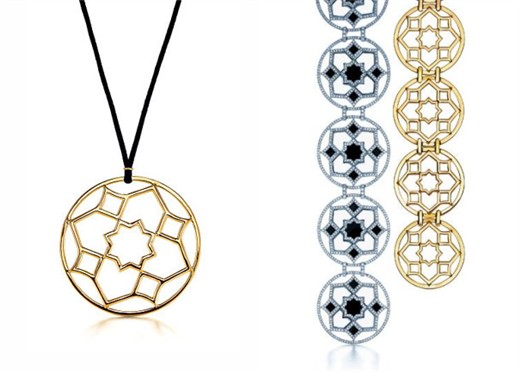 Tiffany设计师帕洛玛·毕加索以其对绘画和时尚珠宝的独特品位推出充满动感的几何图案珠宝,令人称奇的是,该系列的灵感竟来自毕加索位于摩洛哥一幢拥有几世纪历史的别墅墙上的马赛克图案。融合了彩色珐琅花砖以及华美几何图形的艺术形式,在毕加索女士的设计之下幻化为现代珠宝设计中中空的正方形、多角形和圆形,材质上采用18K黄金或白金,包含了镶钻及宝石的拱形戒指、圆形吊坠以及纤细的黑色和白色珐琅项链。