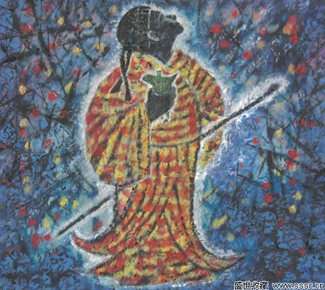 罗小华的这幅《把酒问青天》,灵感来自唐代诗人李白的著名诗篇《月下独酌》,她将李白的这首《月下独酌》用自己独有的绘画语言描述出来。在创作手法上我们可以看到画者运用了强烈的对比色彩共融的手法,这种强烈的色彩对比,从文雅的传统国画中脱颖而出,也从西方写实主义中脱颖而出。兰与黄两种对立色彩的运用将画家极力想要表现的意境用对立的手法表现出来。画中的诗人端着酒杯仰望苍穹的身影向画外观者传达出独酌的感伤与思想的碰撞。这种色彩创作手法从罗小华的后期学院派开始就已经出现,直到罗小华94年承接了大型夏尔家画展来中国美术馆展出的长时间里,这种表达感情的色彩更加深深感染罗小华,将强烈色彩交融的表达带入了最高峰。
