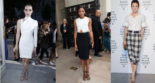 今年白色的风靡让全球明星追着跑,巴黎时装周的秀场上身穿白色系服装的明星多不胜数,其中身穿不规则肩部设计紧身小白裙的艾玛·罗伯茨靓丽抢眼;娜奥米·哈里斯露脐白色短上衣搭配黑色半长裙,简洁干练;就连身着白色新款白衬衫的国际章也让人眼前一亮,干练的手包加上格子裤,一身装扮给人几分OL女性的帅气与干练。