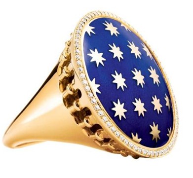 设计师帕洛玛·毕加索一生热爱旅行,威尼斯的运河、 桥梁、宫廷式建筑以及恢弘壮丽的广场深深地吸引着她。Stella这一非凡珠宝系列的灵感源自于威尼斯这座世界上最引人入胜的传奇水城,设计师将八角星图形与威尼斯建筑中常见的阳台围栏轮廓完美融合,以蓝色珐琅为北京并带有闪耀金星图案装饰,采用贵金属材质,这样一枚充满个性却又精致的一枚戒指,将你带入一场奇幻的旅行。