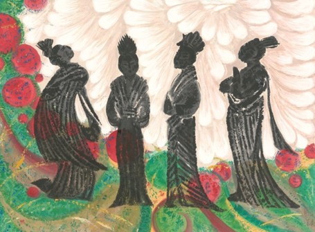 正如罗小华所擅长——将东西方绘画技法融合为一,京剧的产生也是由各种戏曲融合而成。罗小华的风格和她丰富的绘画经历有着密切的联系。《京剧》一作也是融合水墨、水彩等绘画表现形式于一体的佳作。画中的四人就是用水墨笔法勾勒而成,人物形象充满了传统中国画风特点。多彩的下方背景看似一条河流,奔腾蜿蜒,画家仿佛将此比喻为各色曲艺的交融发展,这也是京剧的艺术内核。人物身后淡红色的花朵则象征着京剧之花,艳丽夺目。整幅画面搭配得适当,既有前景的人物,又有后景的承托,富于变化。观者观之赏心悦目,可谓是罗小华别样风格的佳作之一。